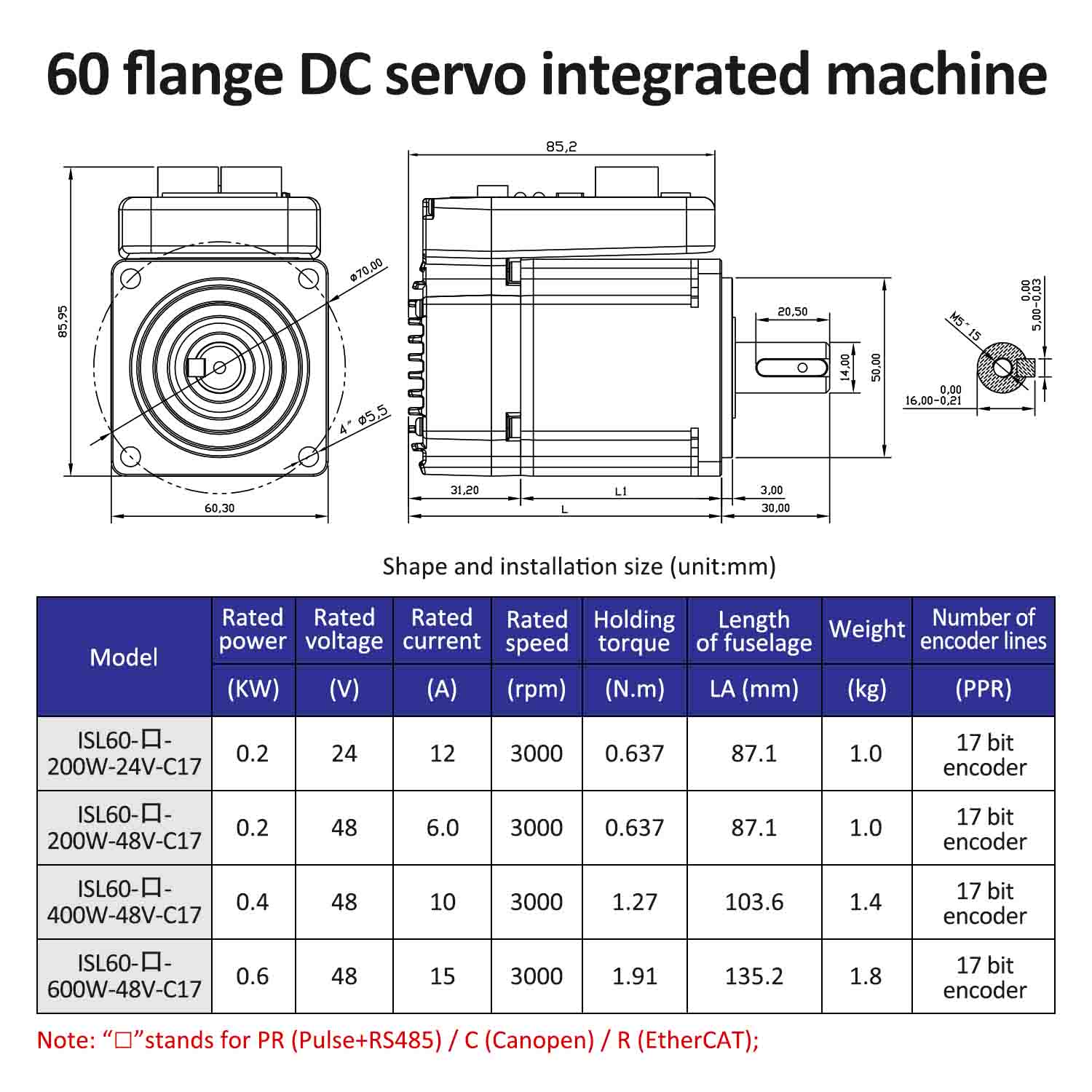 Lichuan Integrated Servo Motors Driver Pulse/RS485/CANopen Control 600W 1.91N.m DC24/48V 6/10/12/15A 3000RPM IP65