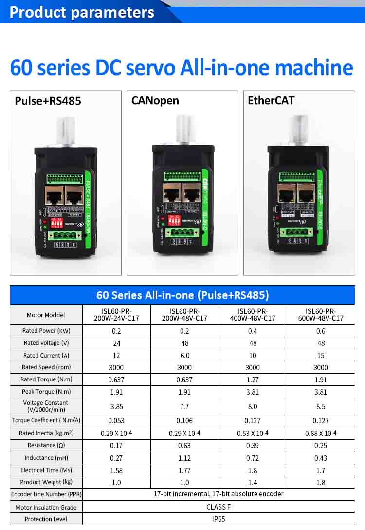 Lichuan Integrated Servo Motors Driver Pulse/RS485/CANopen Control 200W 0.637N.m DC24/48V 6/10/12/15A 3000RPM IP65